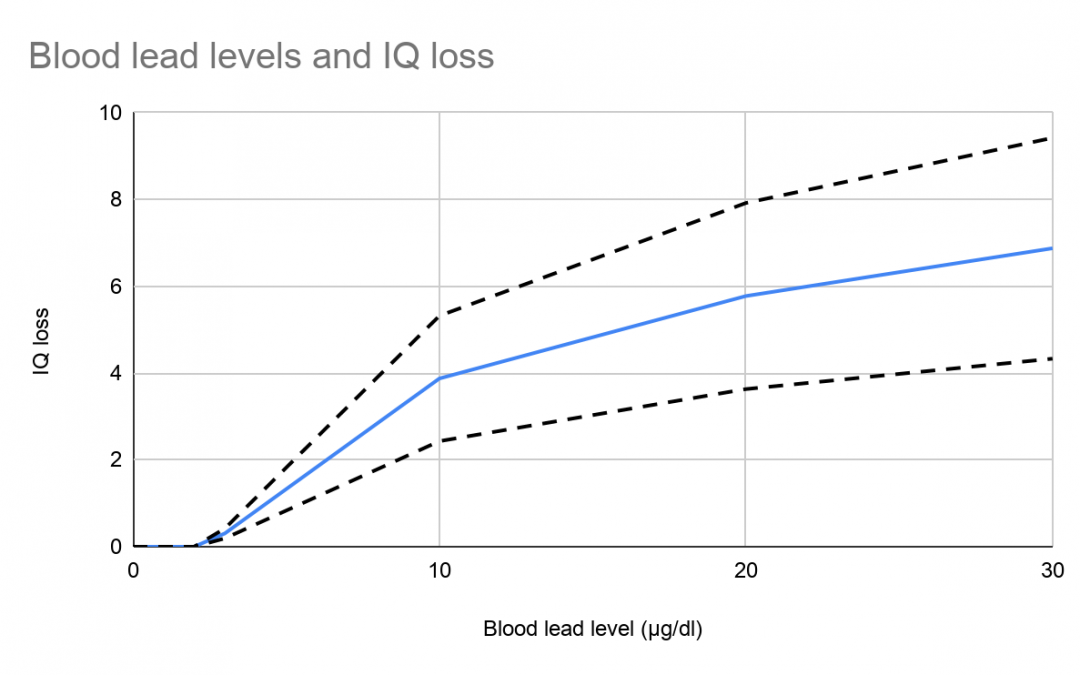 Lead poses a significant danger to children, causing lower IQs, learning difficulties, reduced attention spans and behavioral disorders, which in turn lead to lower educational attainment and consequently lower earnings as adults. Altogether, lead exposure is tied to US$1.4 trillion in income loss due to lower IQs. Multiple studies have calculated IQ decreases and subsequent earning losses due to elevated blood lead levels (BLL).